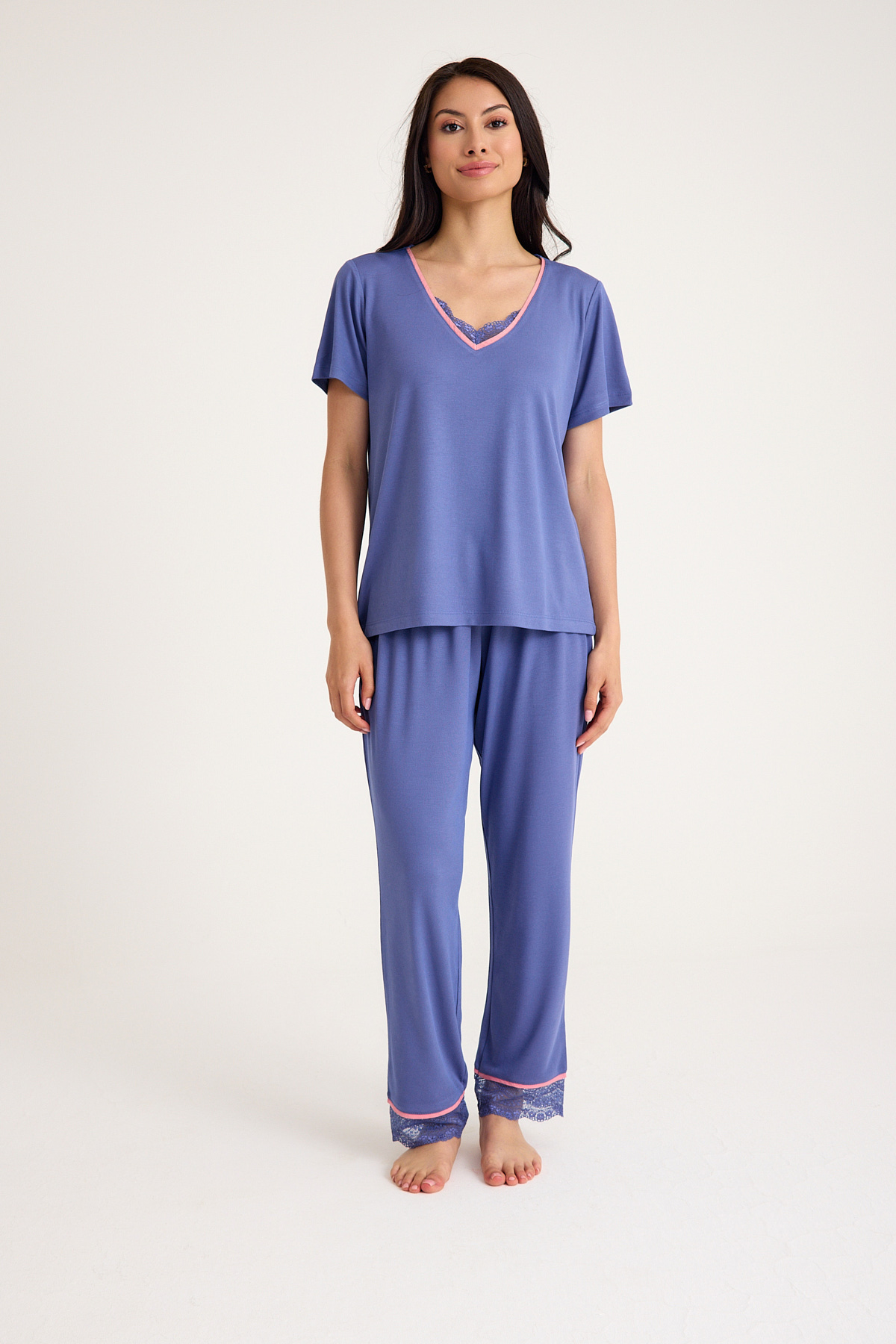Dream Mavi/Pembe V Yaka Dantel Detaylı 4 Parça Pijama Takım Set (AH24500ST)