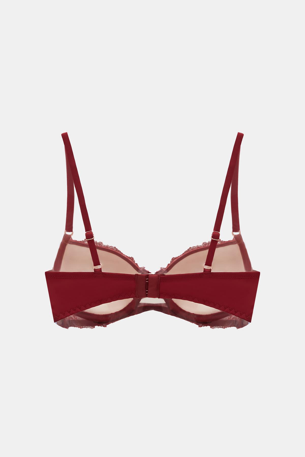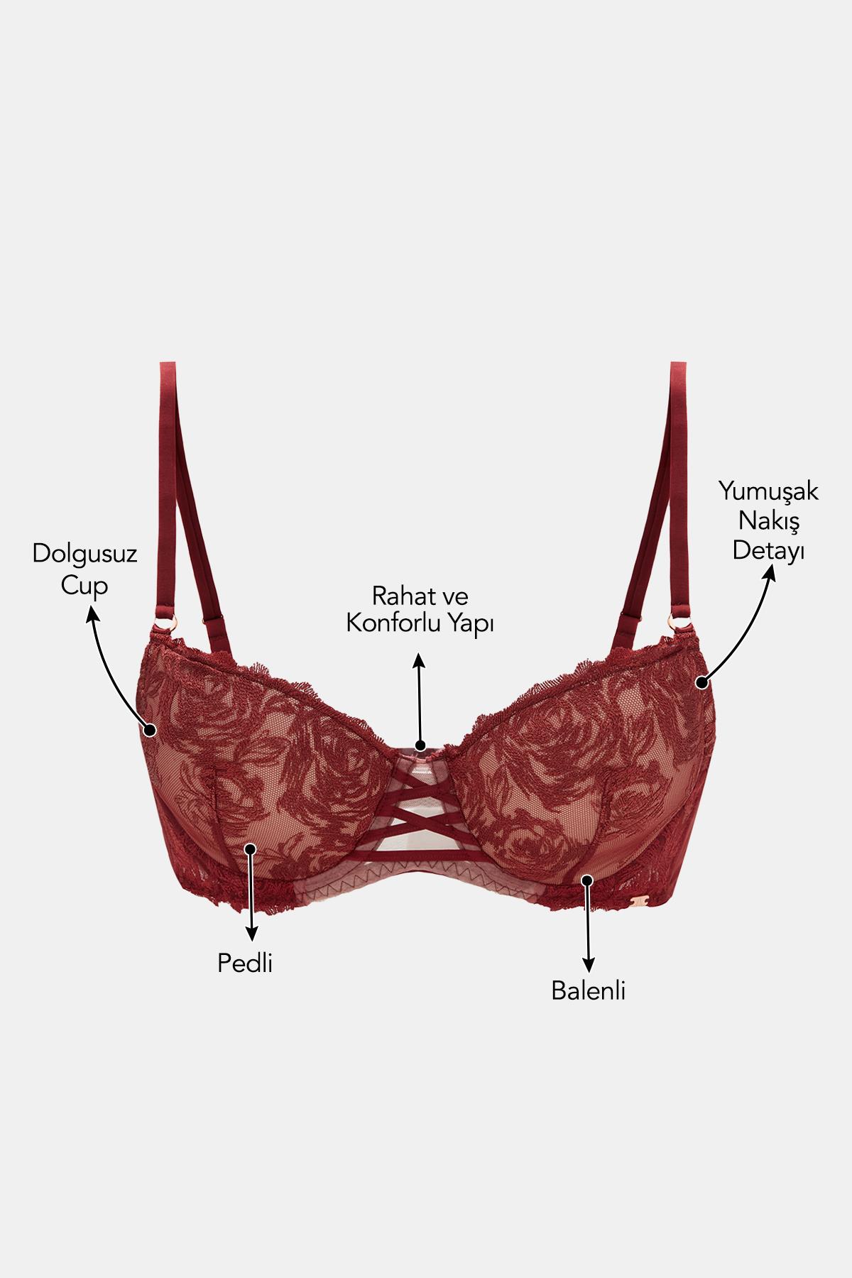 Dolgusuz form, göğsün kendi şeklini korumasına yardımcı olur. Nakışlı tasarım ürüne sofistike bir şıklık ve ince bir duruş kazandırır.